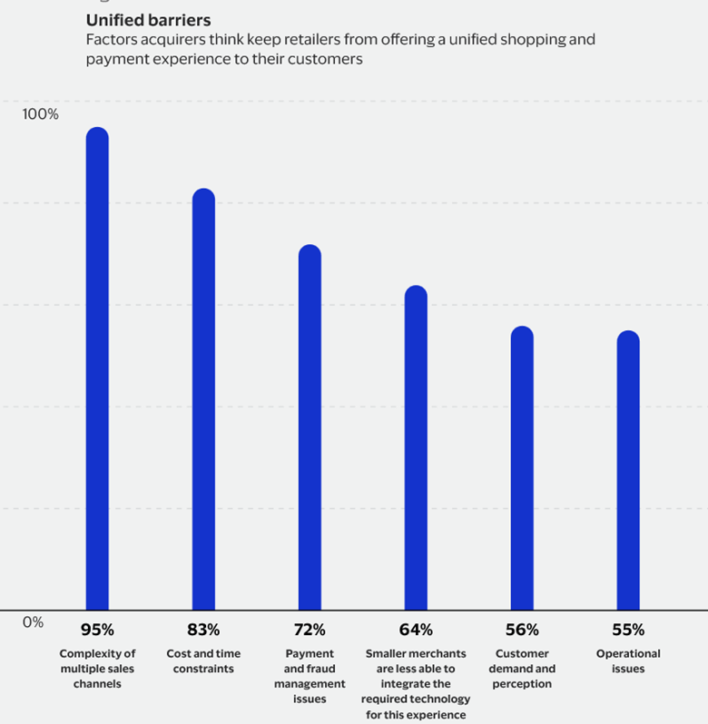 “According to 95% of acquirers, the complexity of managing multiple sales channels is a key challenge for merchants, primarily resulting from difficulties in matching online and in-store payment experiences. Cost and time constraints follow, at 83%.”